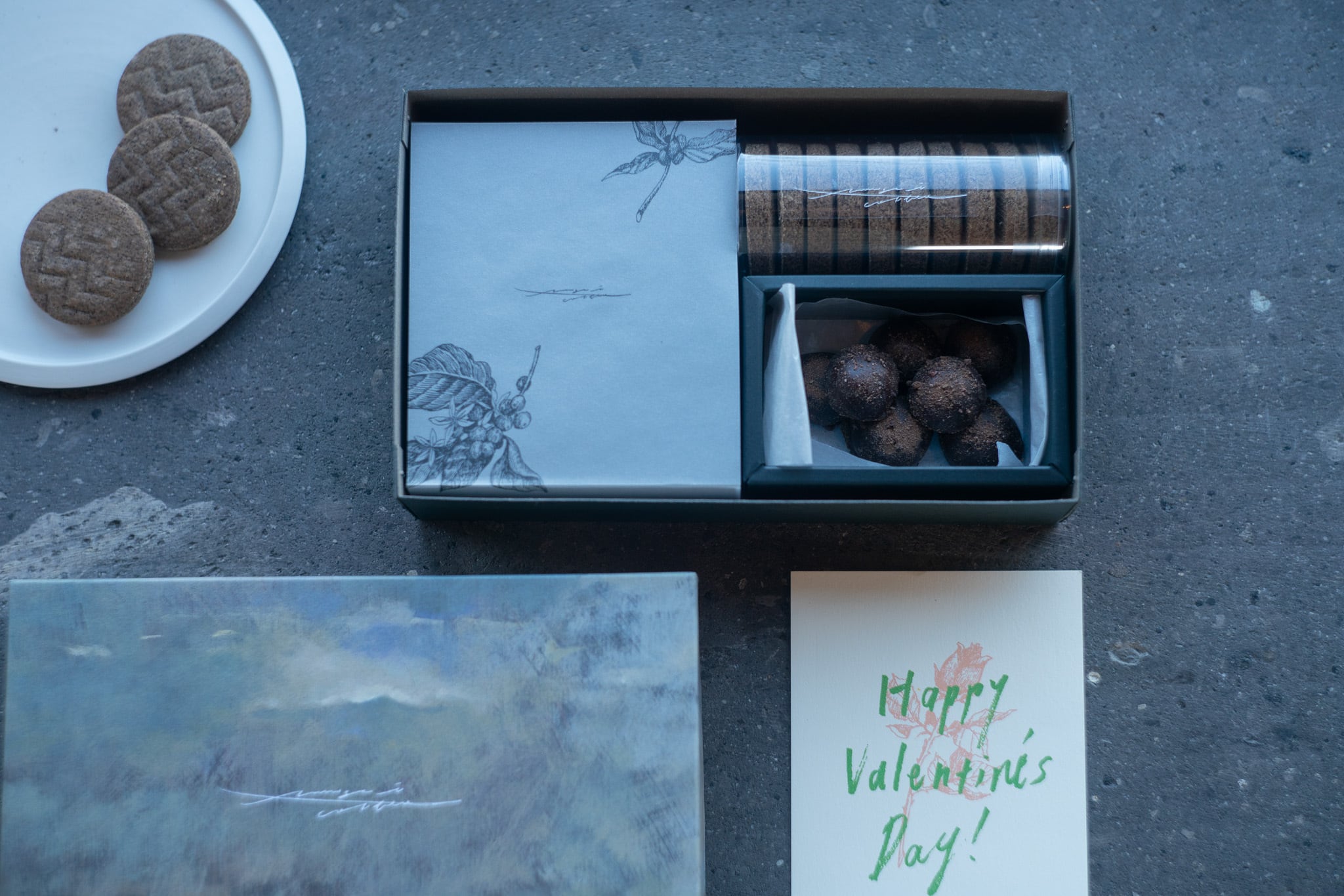 suzunari coffee バレンタイン限定のオリジナルギフトセット。今年はフレンチシェフが営む湯布院の喫茶「uca」が作る金柑のパート・ド・フリュイと、suzunari coffeeのグァテマラを使用したエスプレッソのサブレ、ドリップバッグのセットです。