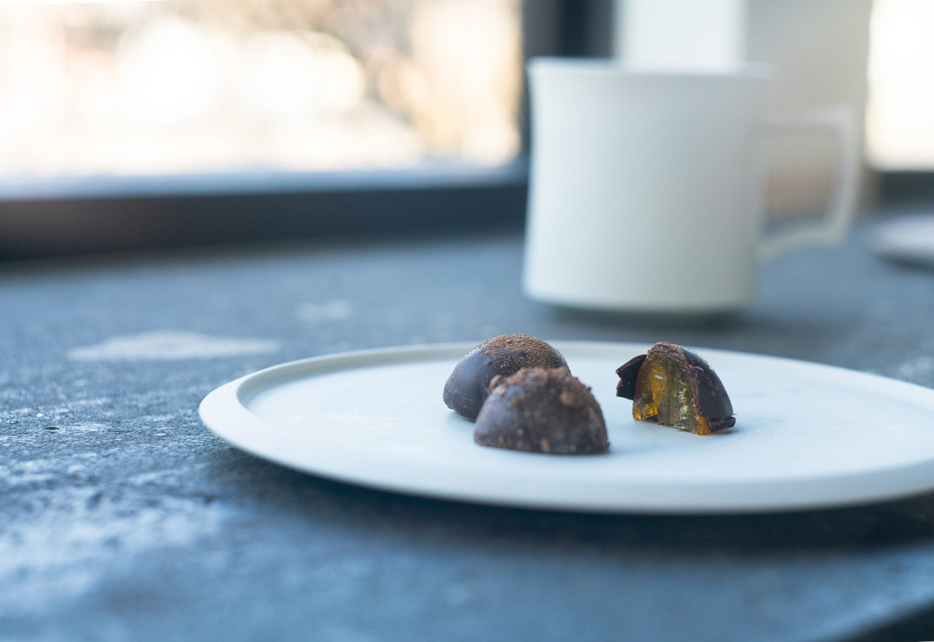 「年賀状です」と言って手渡された黒い箱。その中に入っていたのがこの、金柑の甘露煮をチョコレートで覆ったお菓子でした。年末におばあちゃんがたくさん採ってくれたので作ってみたのだとか。「これ作るのに、一週間かかるんですよ!」と、大変そうに、でも嬉しそうに話すシェフの顔が、いつも眩しい。この人は本当に料理が好きなんだなあ、と、その顔を見るたびに思います。